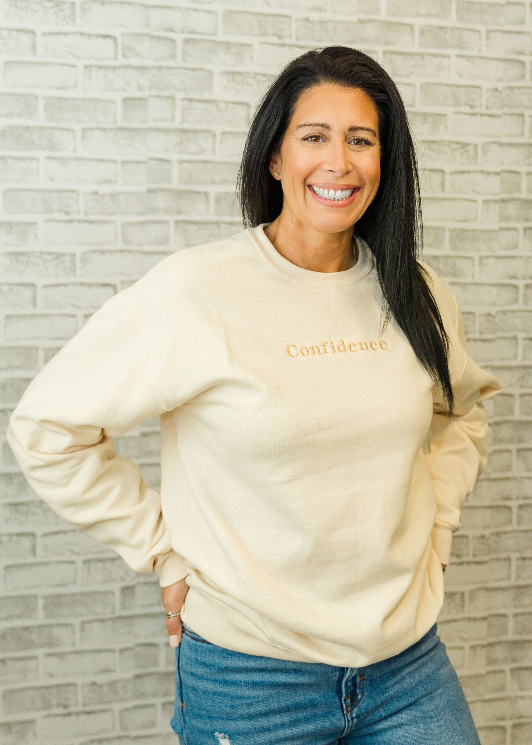 The Confidence Sweater is an original Blue Louise exclusive — designed with our signature mantra, “Confidence is your best accessory,” embroidered across the chest. This soft, cozy crewneck has a relaxed fit with just the right amount of structure, making it perfect for layering or wearing on its own.