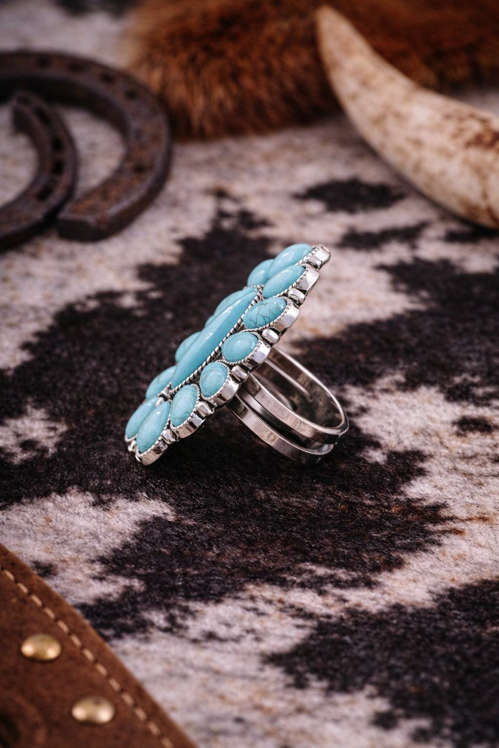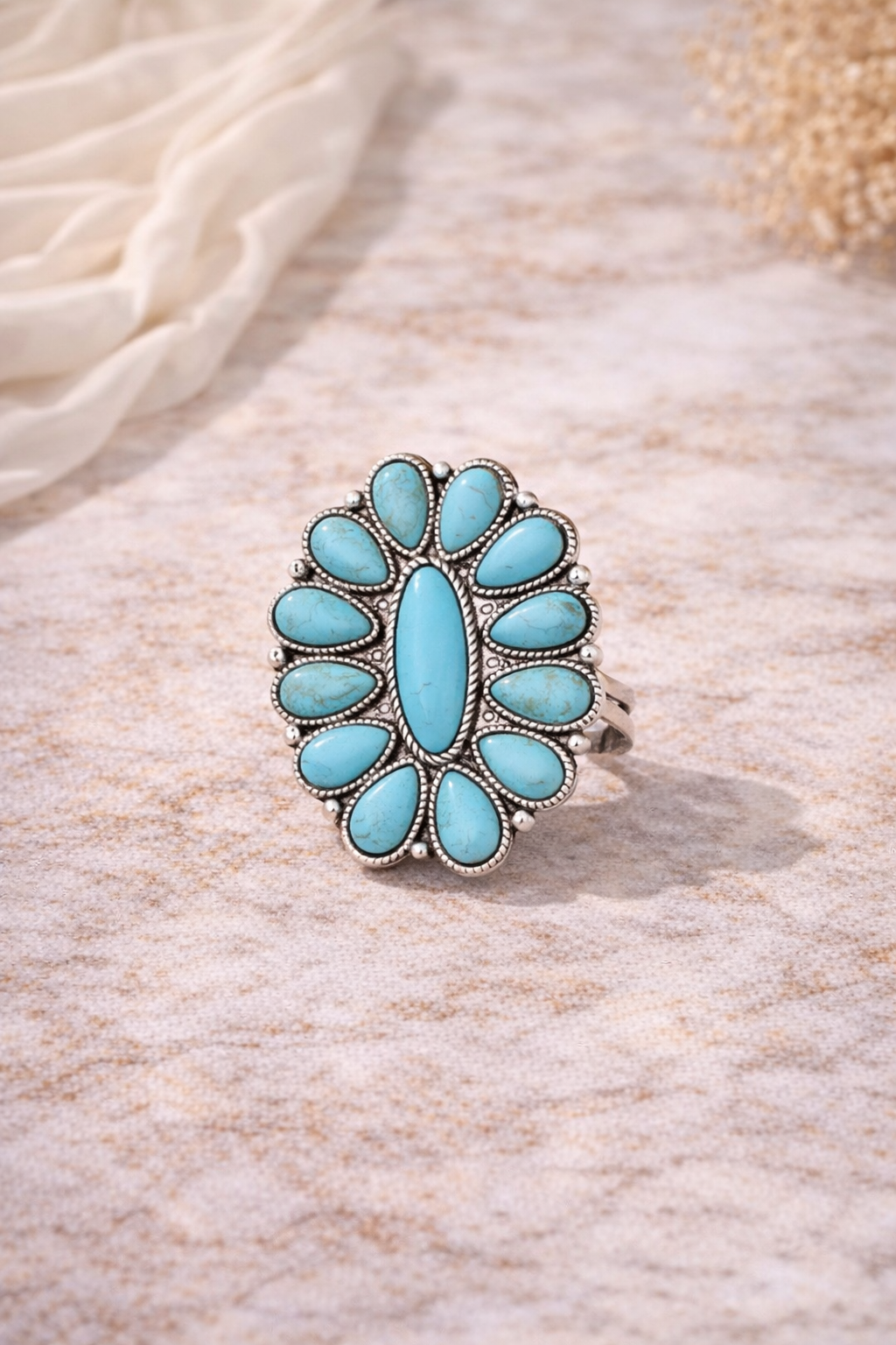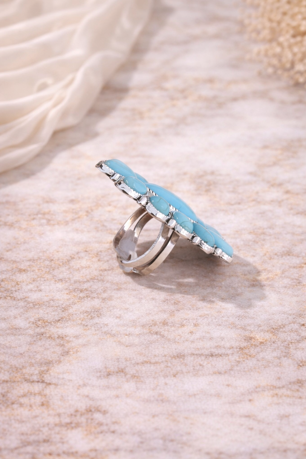 Striking turquoise-inspired stone design surrounded by intricate silver-tone detailing. With its oversized silhouette and floral-inspired arrangement, this piece makes a confident statement while still feeling wearable.