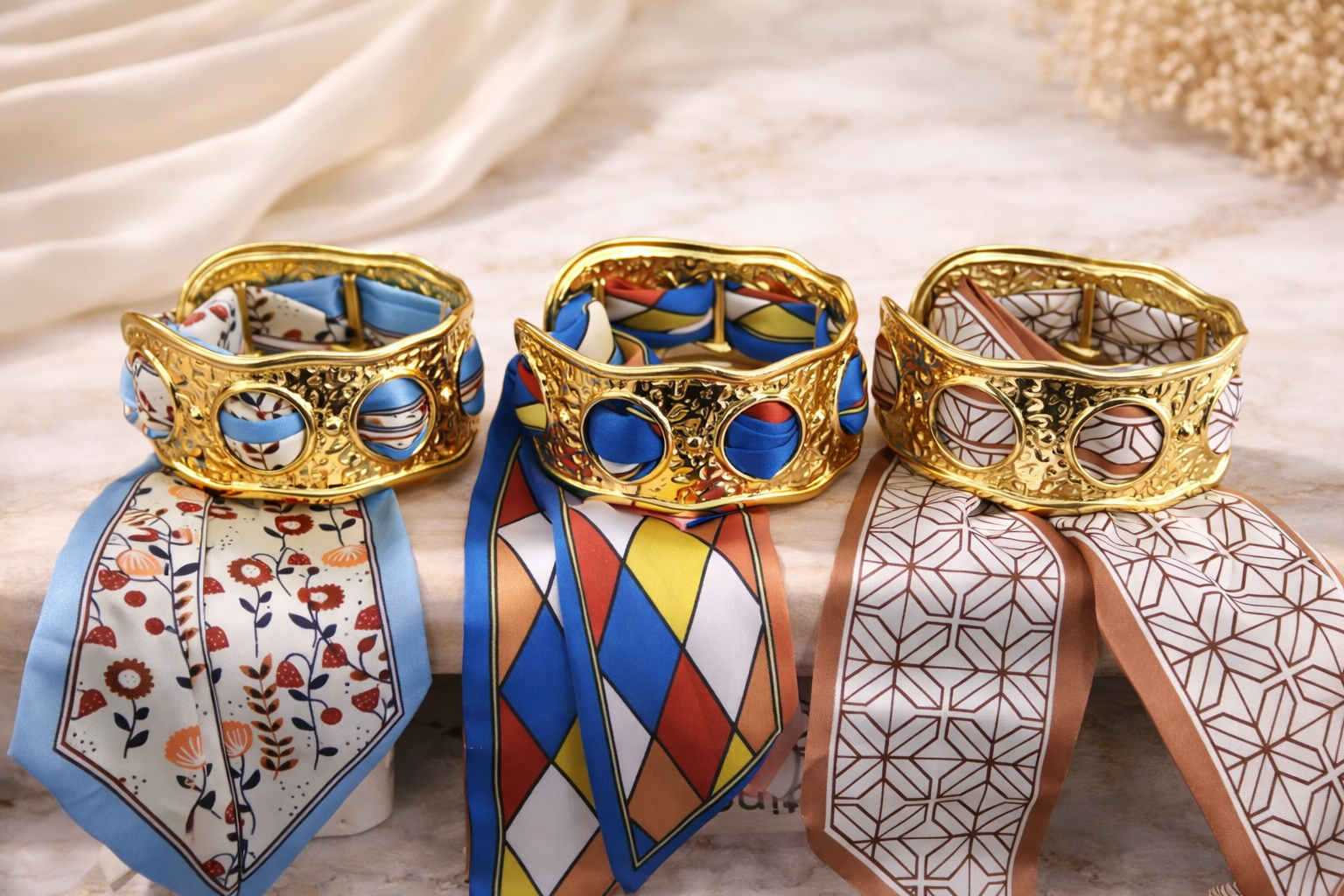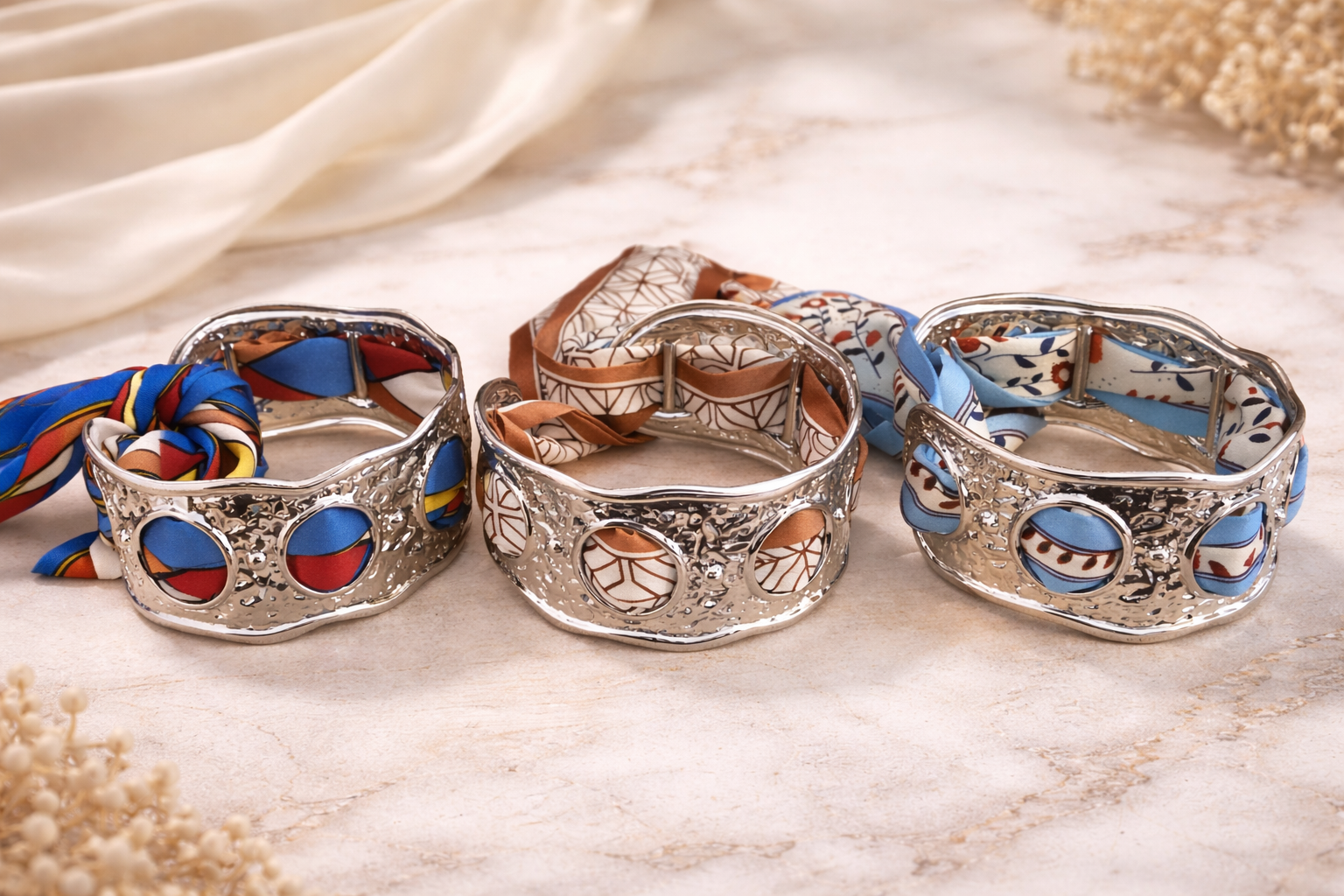 The Silk Bracelet is where structure meets softness. A polished metal cuff wrapped with silk detail for an effortless statement.