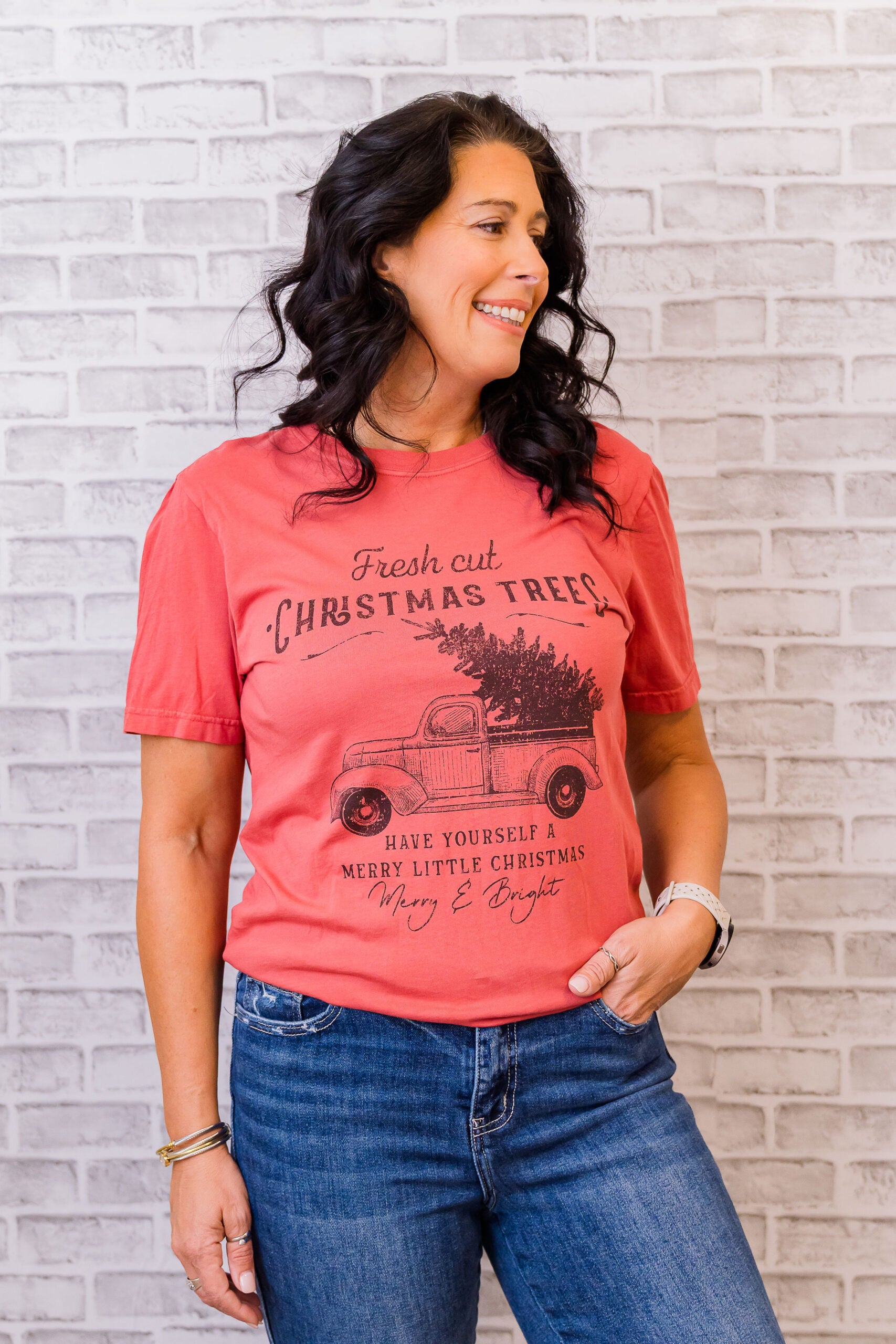 Details: Crew neckline, short sleeve, vintage “Fresh Cut Christmas Trees” print